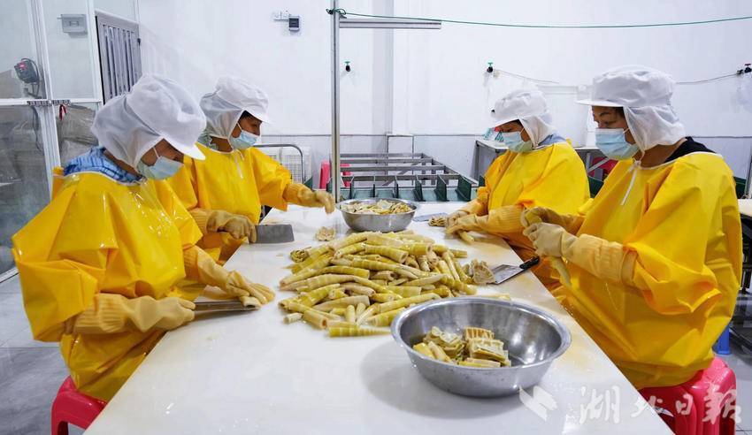 今年,竹笋又有了新吃法。通过政府相关部门指导,湖北省郊野绿色食品有限公司将AI新技术融入配方调试,根据不同地区的口味需求,测算出精准的原料配比,推出了竹笋鸡蛋糕等特色新品。采摘的新鲜竹笋回到工厂,经过清洗、预煮、去皮、切分等多道工序后,即将成为新品——竹笋鸡蛋糕的核心优质原料。